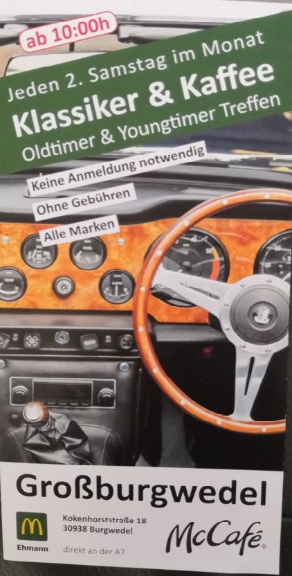 Jeden 2. Samstag im Monat treffen sich zwischen 10:00 Uhr und 16:00 Uhr auf dem Parkplatz bei McDonalds in Großburgwedel Old- und Youngtimerfahrzeuge. - Adresse: Kokenhorststraße 18, 30938 Burgwedel - Eine Internetseite mit mehr Infos dazu, haben wir NICHT gefunden